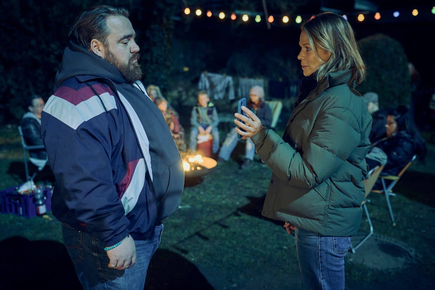 Maris (Jessica Schwarz) zeigt Gustl Kessler (Tristan Seith) auf ihrem Handy das Bild einer Frau.