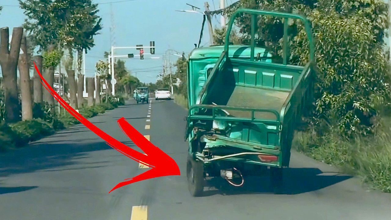 Der Fahrer eines Lasten-Dreirads in der chinesischen Provinz Jiangsu war am Limit unterwegs: Das demolierte Fahrzeug rumpelte über die Straße – dass sich der Kleintransporter überhaupt auf der Fahrbahn halten konnte, grenzt an ein Wunder.