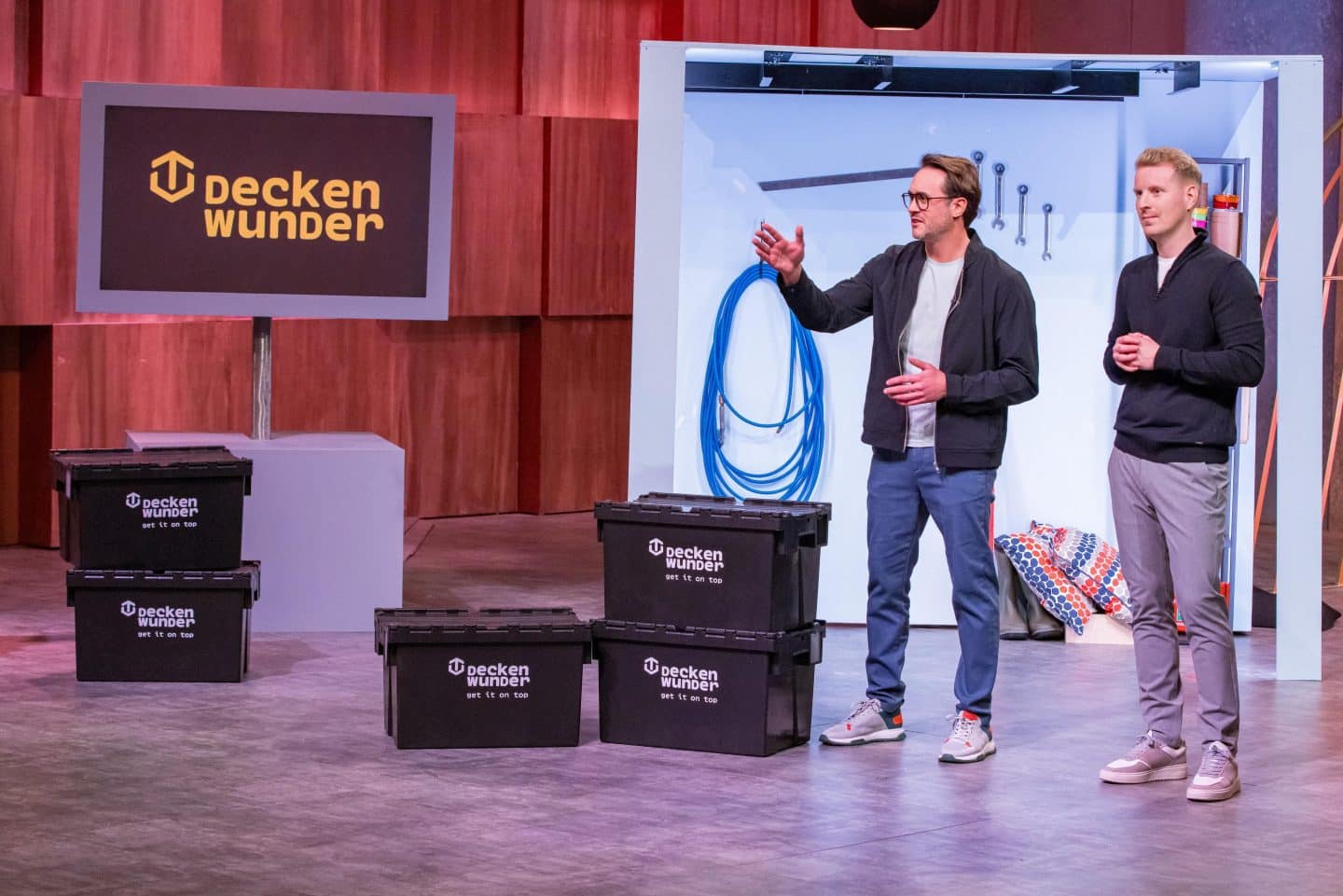 Mario Jacobi (l.) und Georg Pichler präsentieren mit Deckenwunder eine Stauraumlösung für Keller und Garage. Sie erhoffen sich ein Investment von 200.000 Euro für 20 Prozent der Firmenanteile.+++ Die Verwendung des sendungsbezogenen Materials ist nur mit dem Hinweis und Verlinkung auf RTL+ gestattet. +++