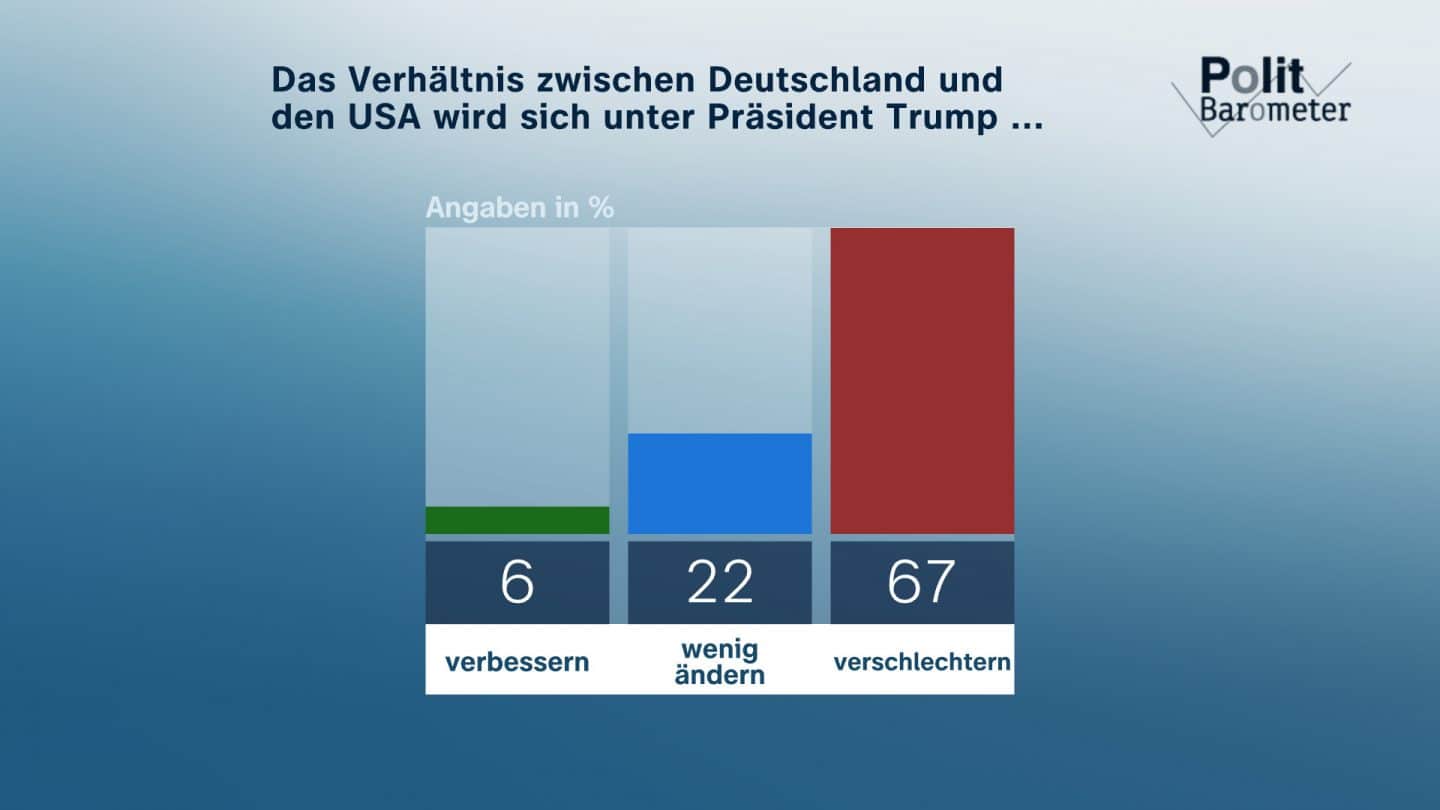Die Wiederwahl von Donald Trump als Präsident der USA stößt in Deutschland auf Skepsis. 67 Prozent der Befragten befürchten eine Verschlechterung der deutsch-amerikanischen Beziehungen. Zudem sehen 77 Prozent in Trump eine Gefahr für die Demokratie in den USA, und 65 Prozent zweifeln an der zukünftigen militärischen Unterstützung Europas durch die USA.