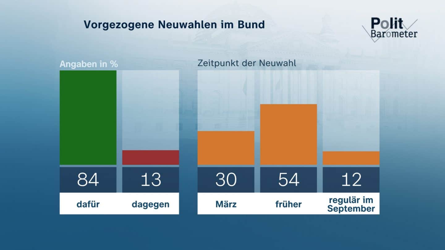 Mit Blick auf mögliche Neuwahlen hat Olaf Scholz angekündigt, im Januar 2025 die Vertrauensfrage im Bundestag zu stellen, um Neuwahlen im März zu ermöglichen. Ein früherer Wahltermin wird jedoch von 54 Prozent bevorzugt, während nur 30 Prozent mit einem Termin im März zufrieden wären. Die Oppositionsparteien fordern eine schnellere Entscheidung – ein Wunsch, den viele Bürger teilen.