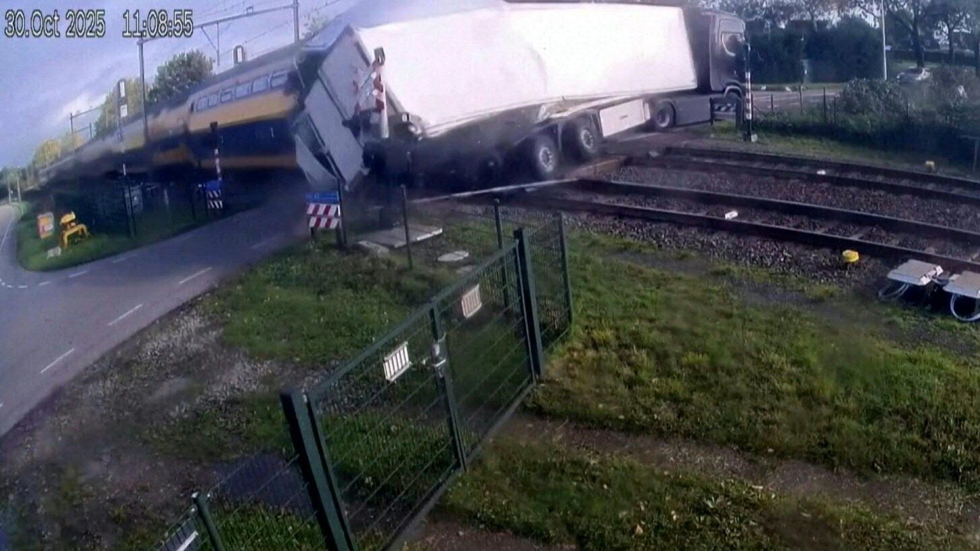 In Meteren in den Niederlanden verhakt sich ein Lastwagenfahrer in den Schranken eines Bahnübergangs. Bevor er einen Ausweg findet, kracht ein Zug in den Laster, der kistenweise Birnen geladen hat.