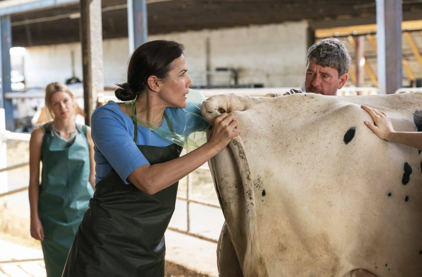 ARD/MDR ZWEI FRAUEN FÜR ALLE FELLE 2, „Väter und Töchter“, am Freitag (05.09.25) um 20:15 Uhr im ERSTEN. Lisa Rothe (Lilly Barshy) schaut zu, während Maja (Bettina Zimmermann, m.) Kuh Lotte mit Besitzer Dirk Rothe (Peter Schneider) untersucht © MDR/Thomas Dietze, honorarfrei – Verwendung gemäß der AGB im engen inhaltlichen, redaktionellen Zusammenhang mit genannter MDR-Sendung bei Nennung „Bild: MDR/Thomas Dietze“ (S2+). MDR/HA Kommunikation, 04360 Leipzig, Tel: (0341) 300 6477 oder – 6463